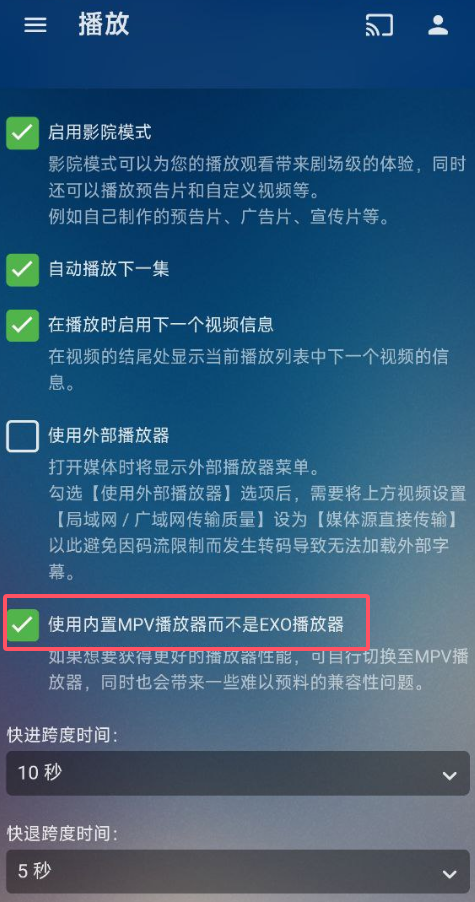 2 emby 版 : 下载1 勾选内置mpv播放器